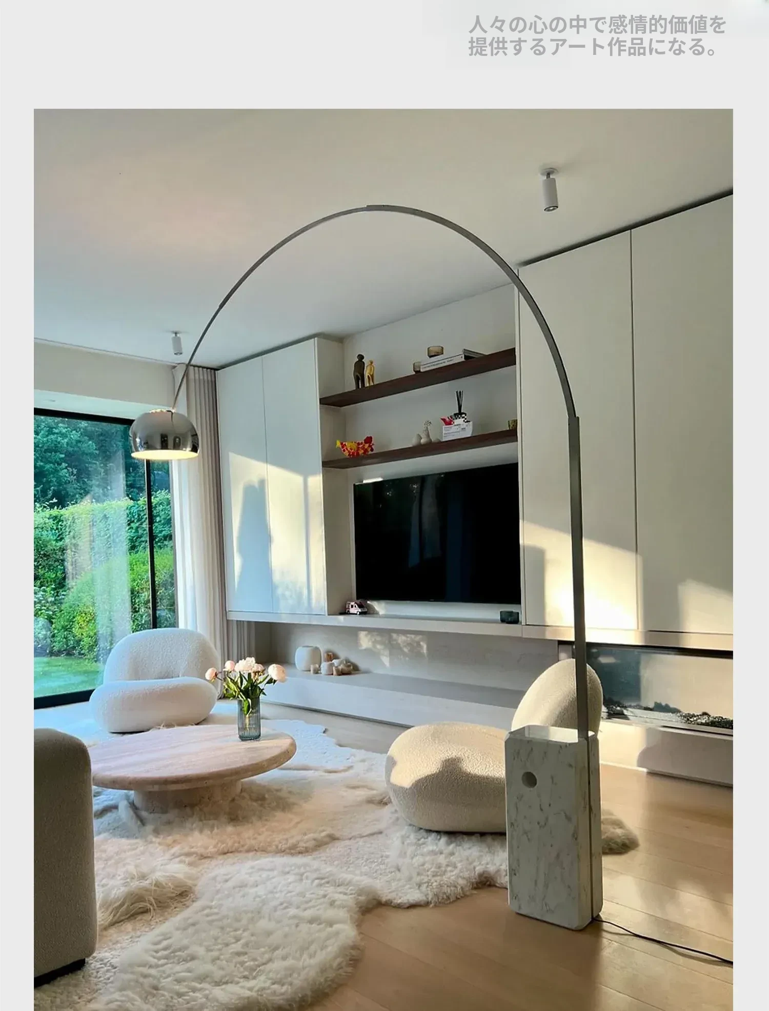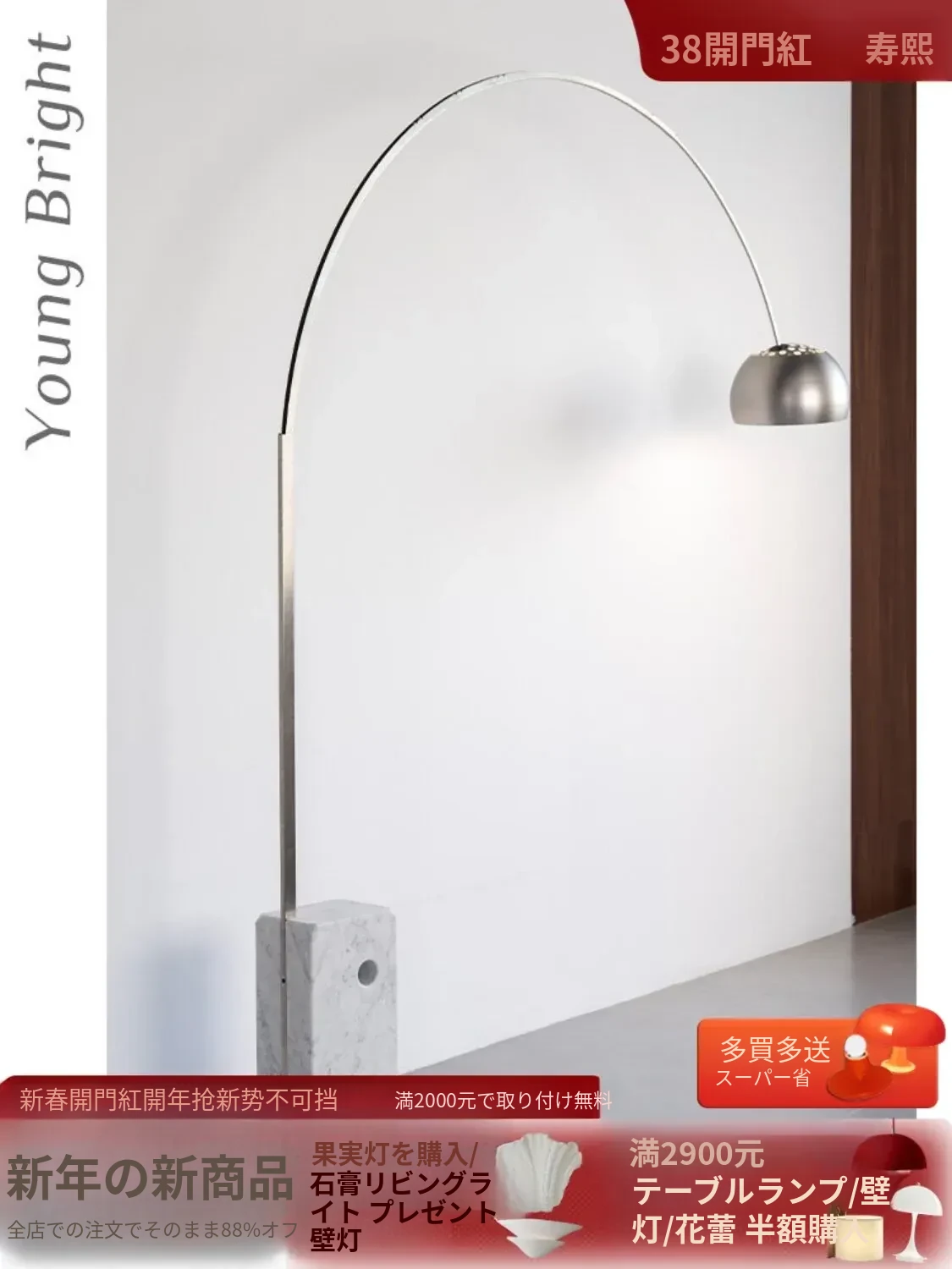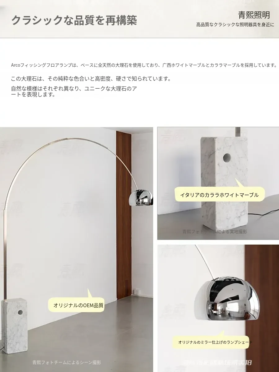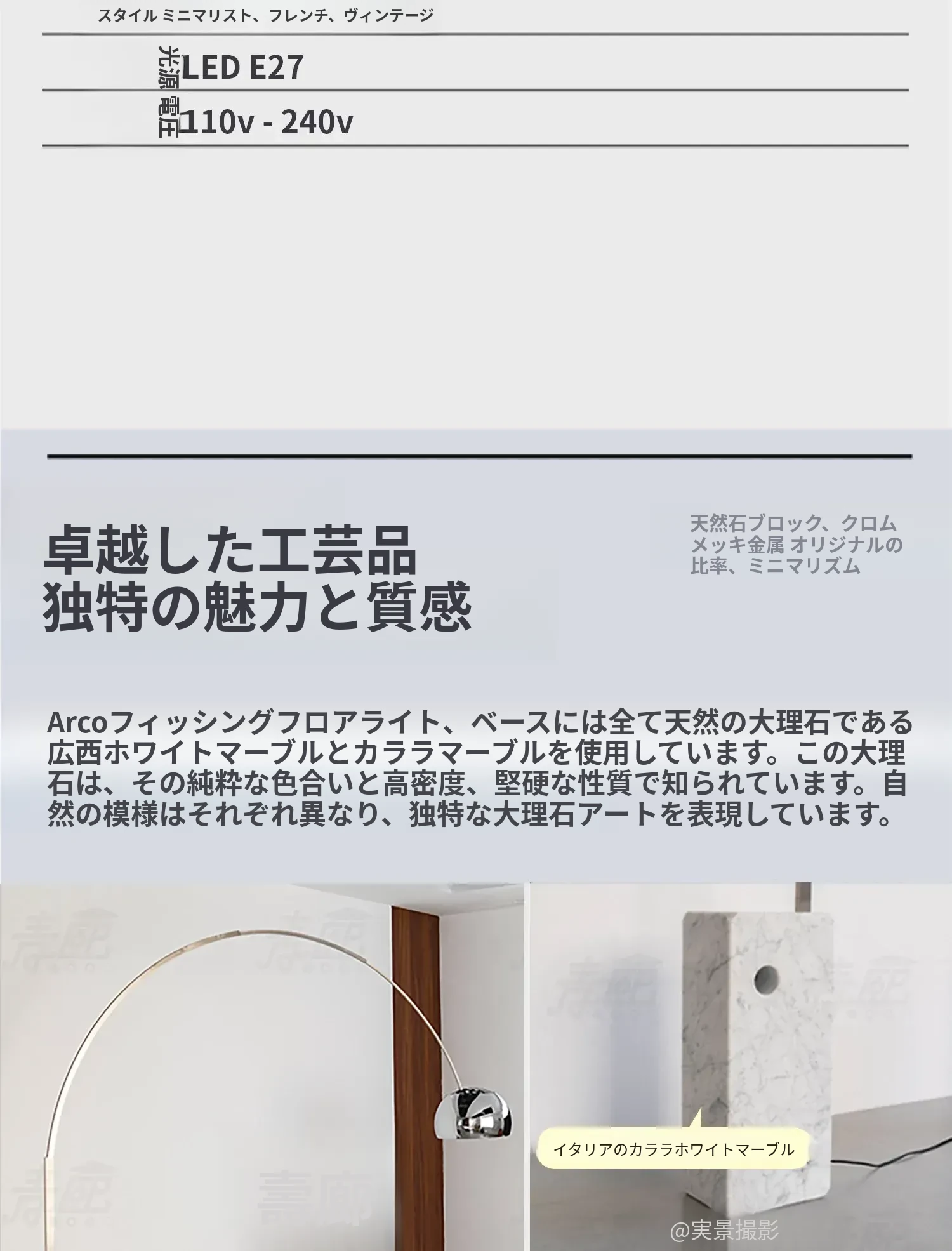 イタリア製アーコフロアランプ - 大理石製フィッシングランプ、軽やかなフレンチデザインで別荘にもぴったり!シンプルでスタイリッシュなリビングのソファ横に最適な照明です。