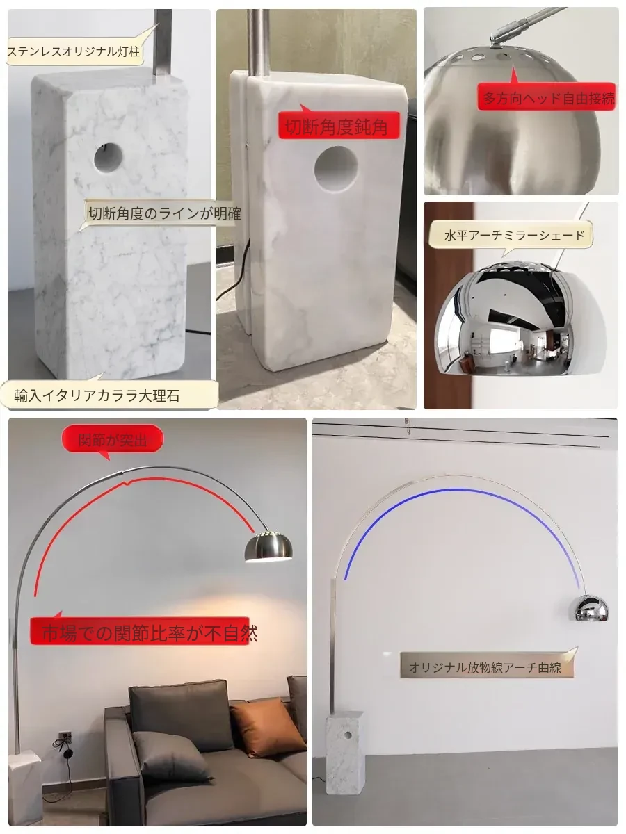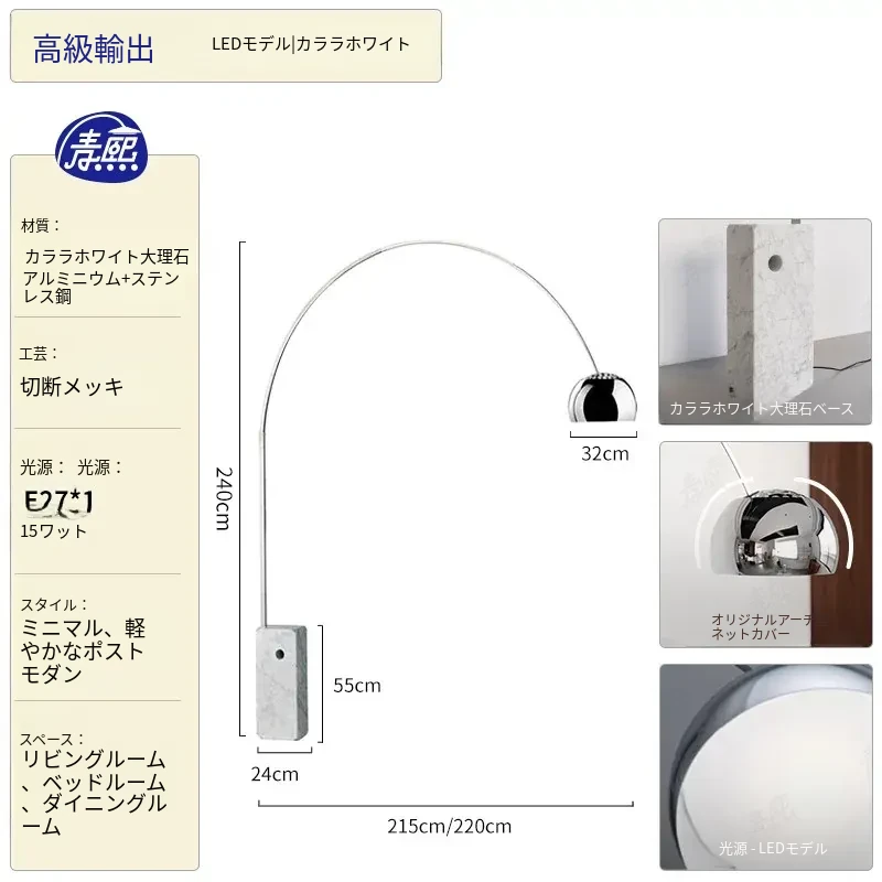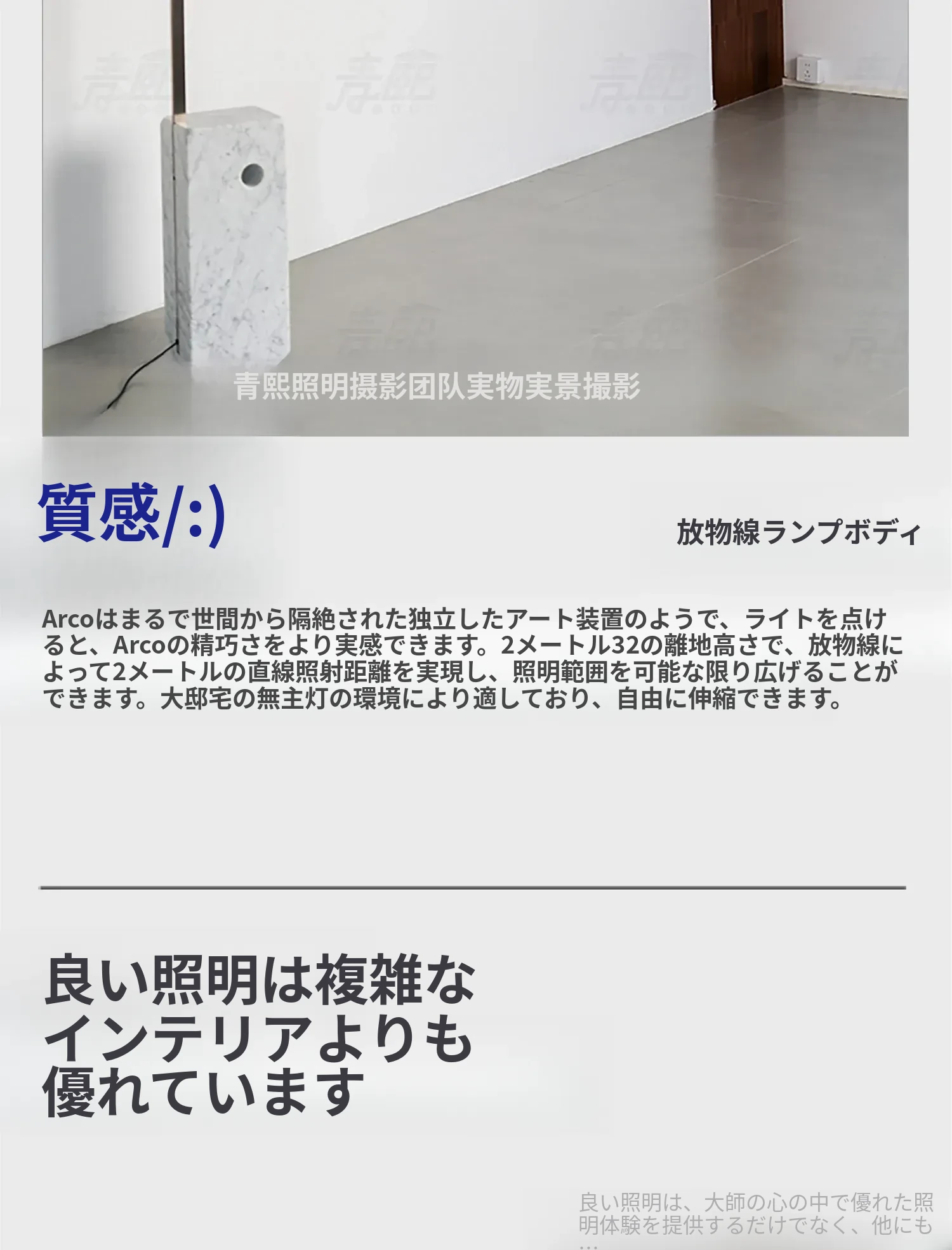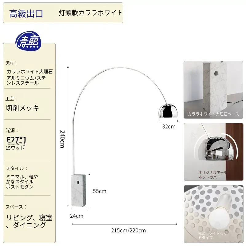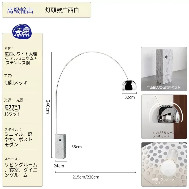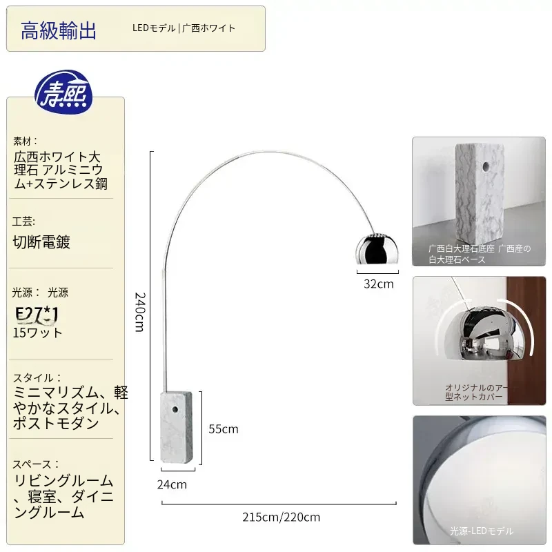 イタリア製アーコフロアランプ - 大理石製フィッシングランプ、軽やかなフレンチデザインで別荘にもぴったり!シンプルでスタイリッシュなリビングのソファ横に最適な照明です。