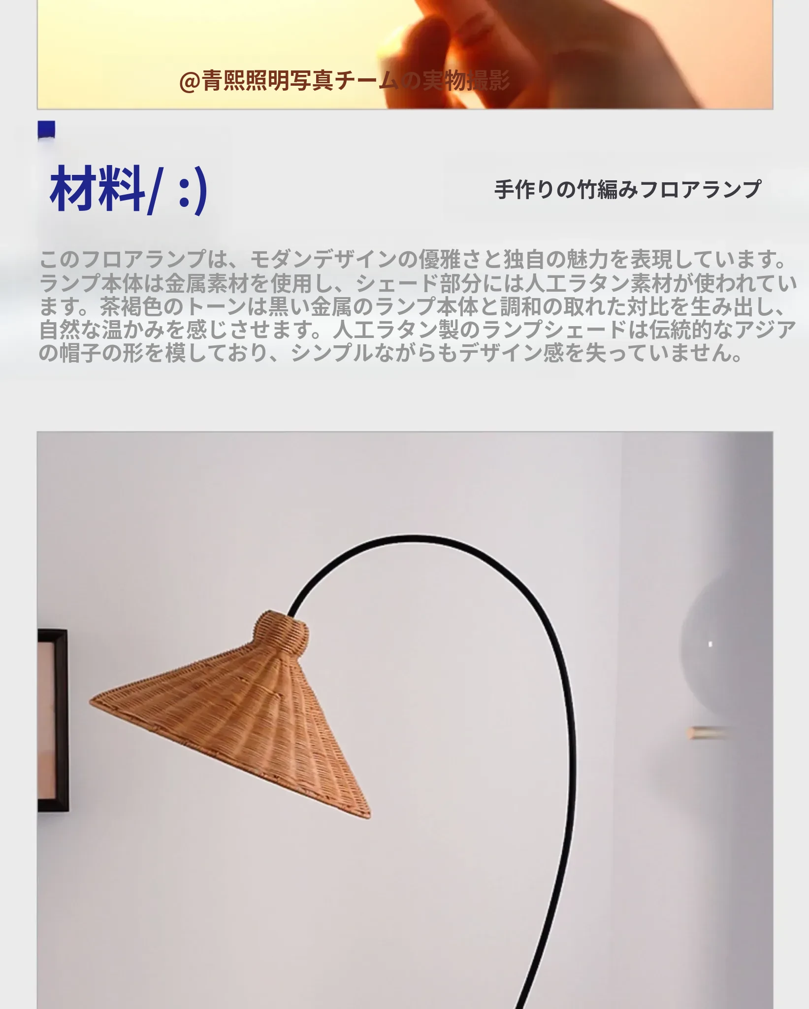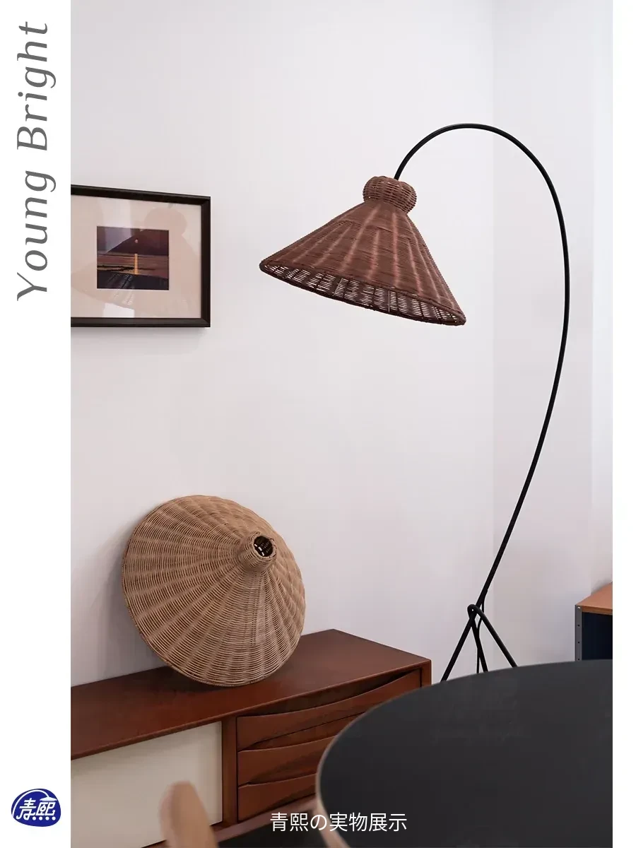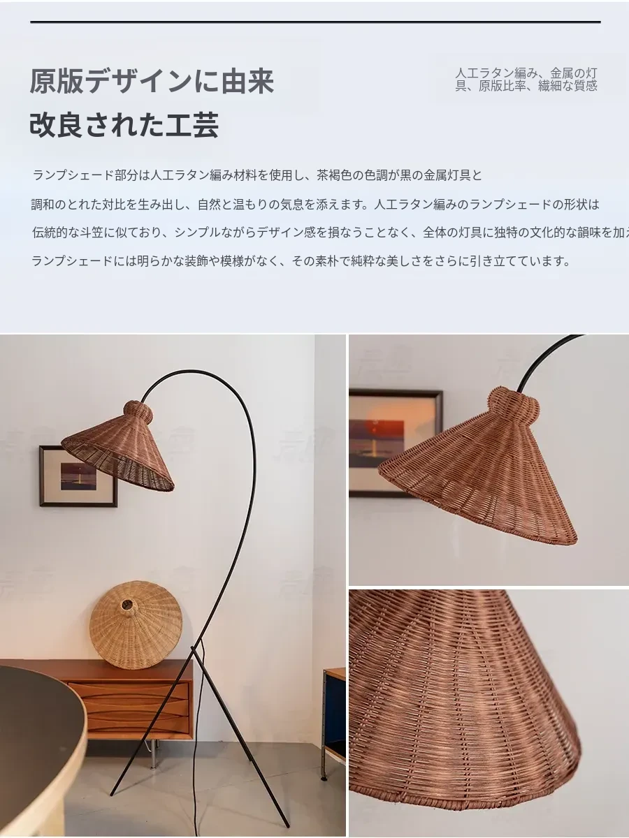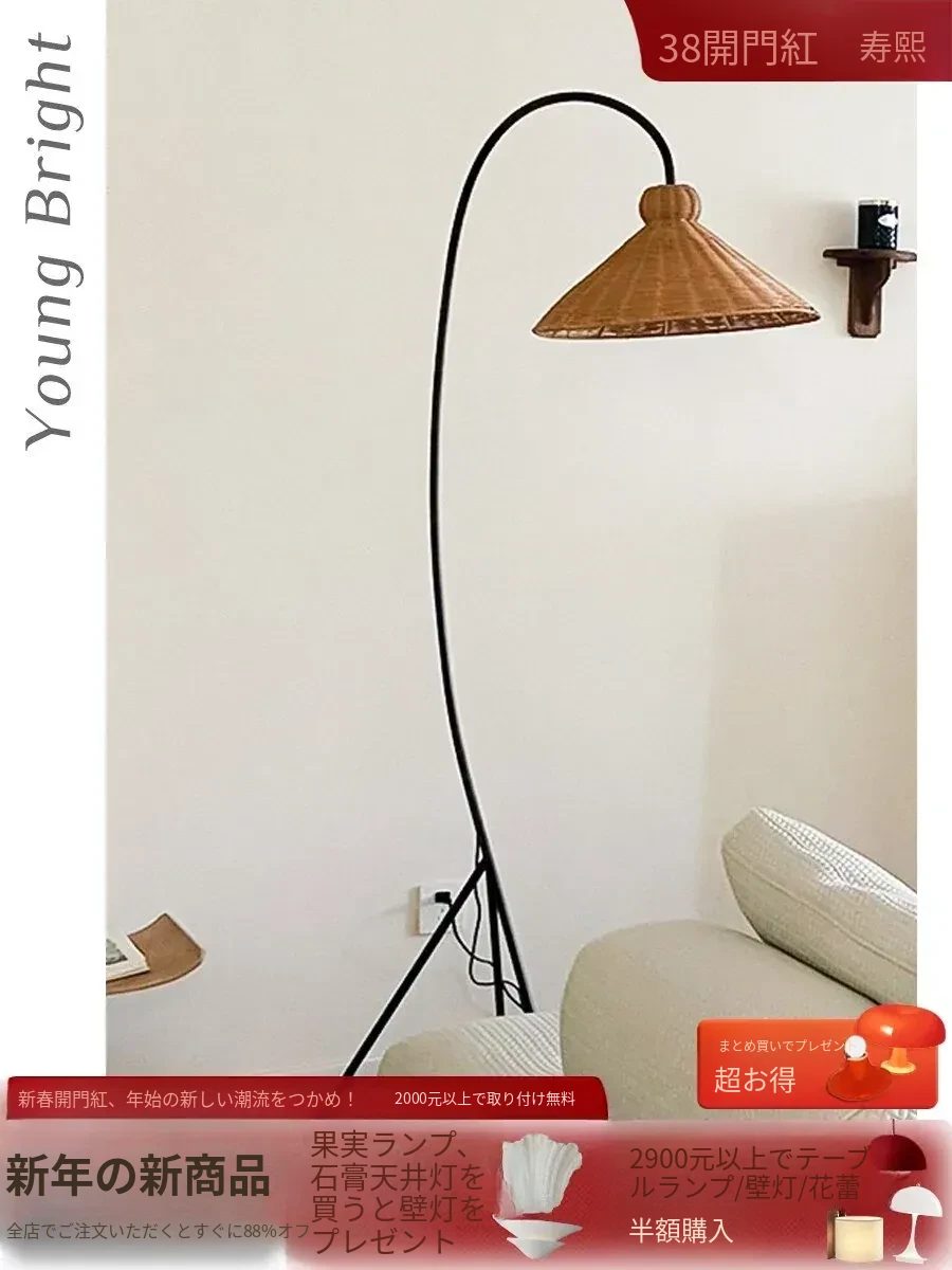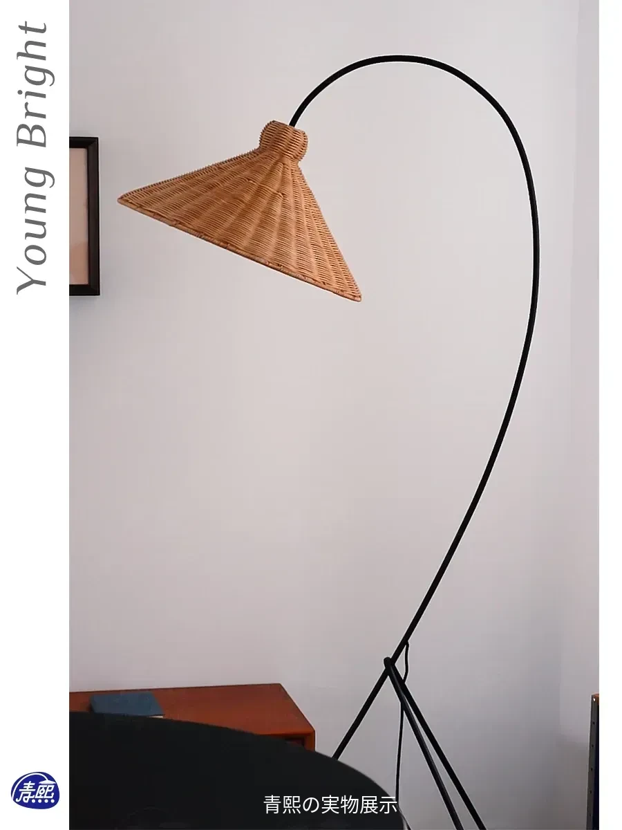 中古フランス製アテナ藤編み侘び寂び風フィッシングフロアランプ 新中式リビングソファ用レトロデザイン照明 - おしゃれで落ち着いた雰囲気を演出!