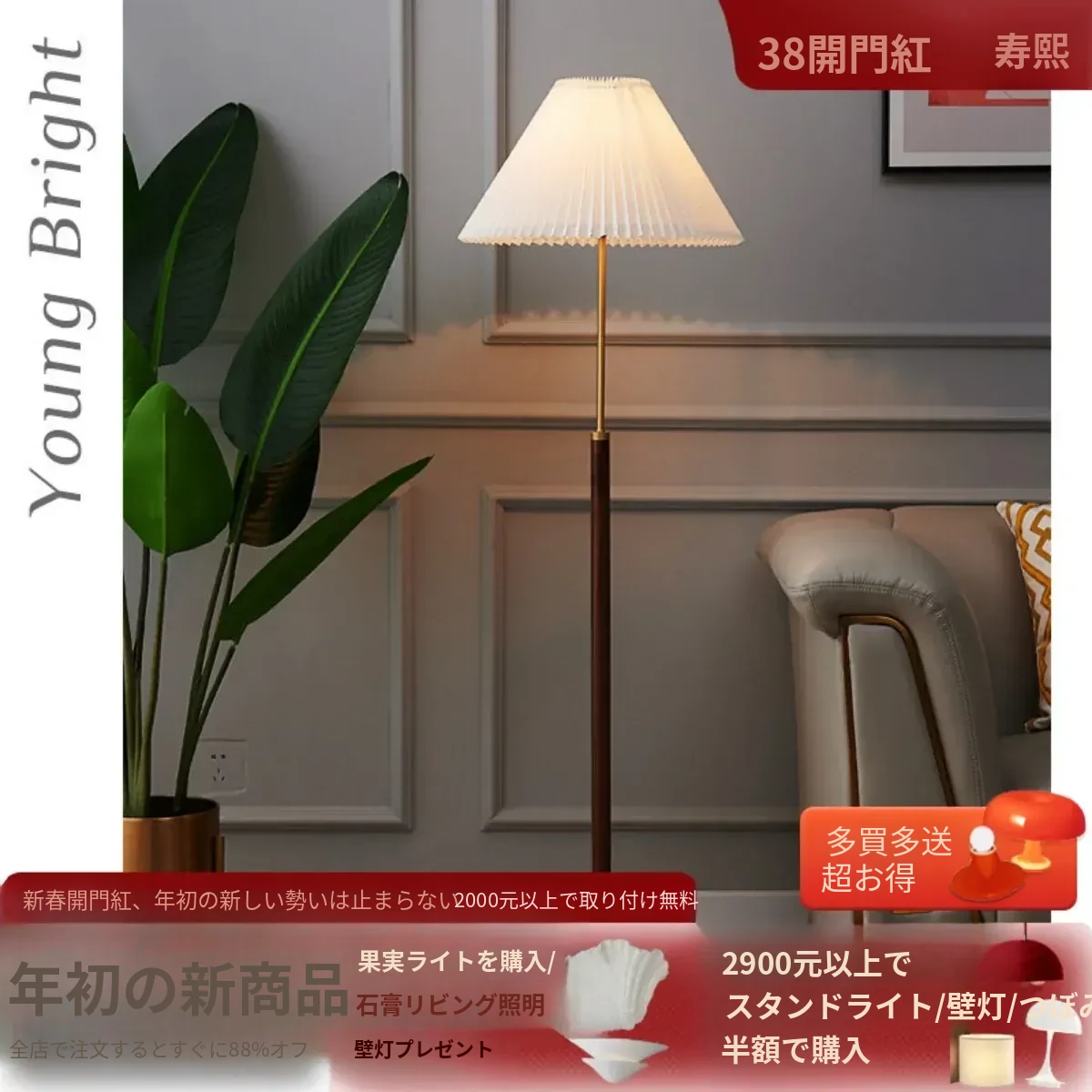 和風レトロフロアランプ|インスタ映えの寝室・リビング・書斎に最適|ウォールナット無垢材×全銅の高級感あふれるプリーツデザイン|おしゃれで温かみのある空間を演出!