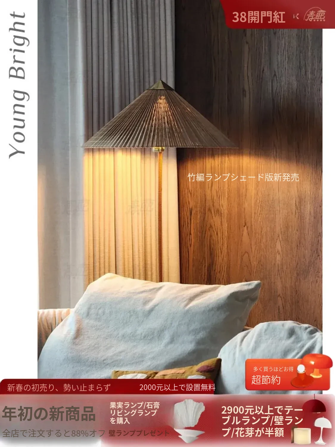 デンマーク9602リビング&ベッドルーム用フロアランプ - フランス風の南洋ヴィンテージ、侘び寂びスタイルの傘型ブラス&ラタンライトで、心地よい空間を演出。